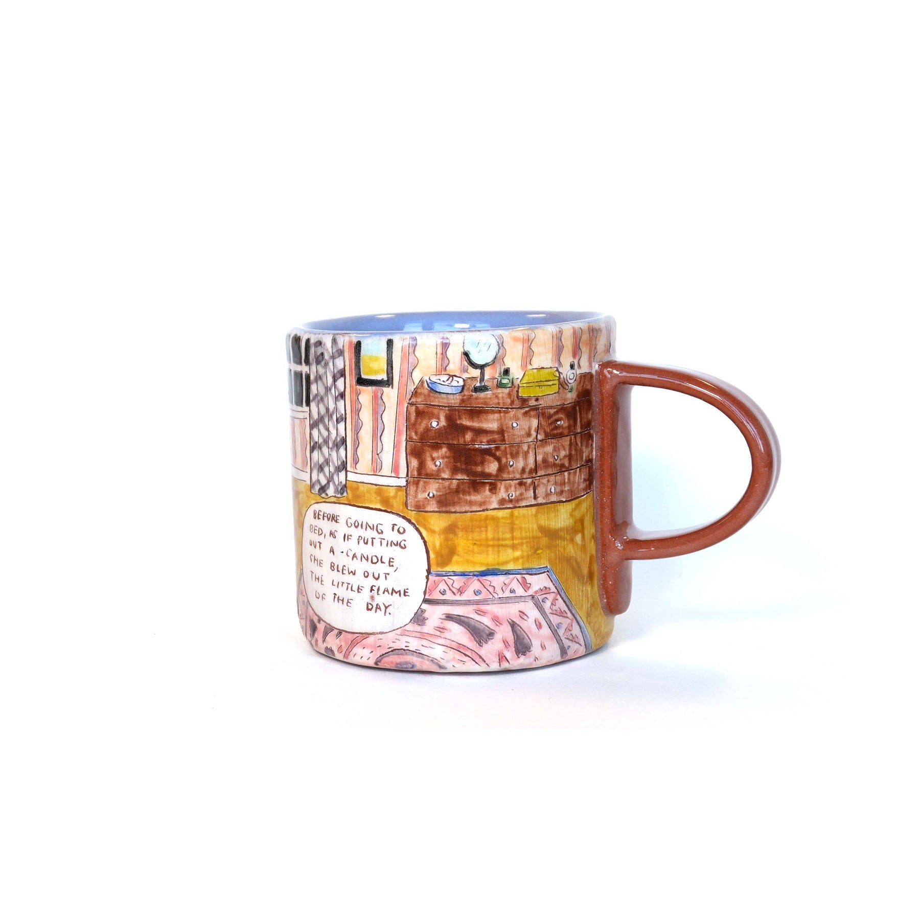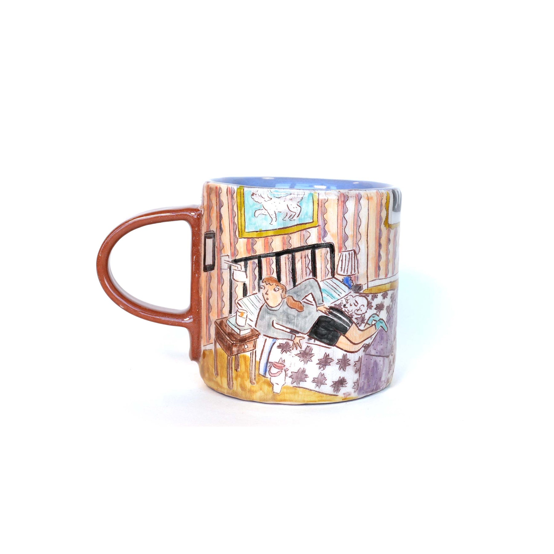 Each piece is wonkily handbuilt and hand-drawn. Each line and color is done by me! If you are looking for a pristine piece of handmade ceramics then this is not it! It is built securely but with character. It is food and microwave safe, but I would recommend lovingly hand-washing it. Each piece is one of a kind, made out of earthenware clay and sgraffito-ed with goofy imagery.