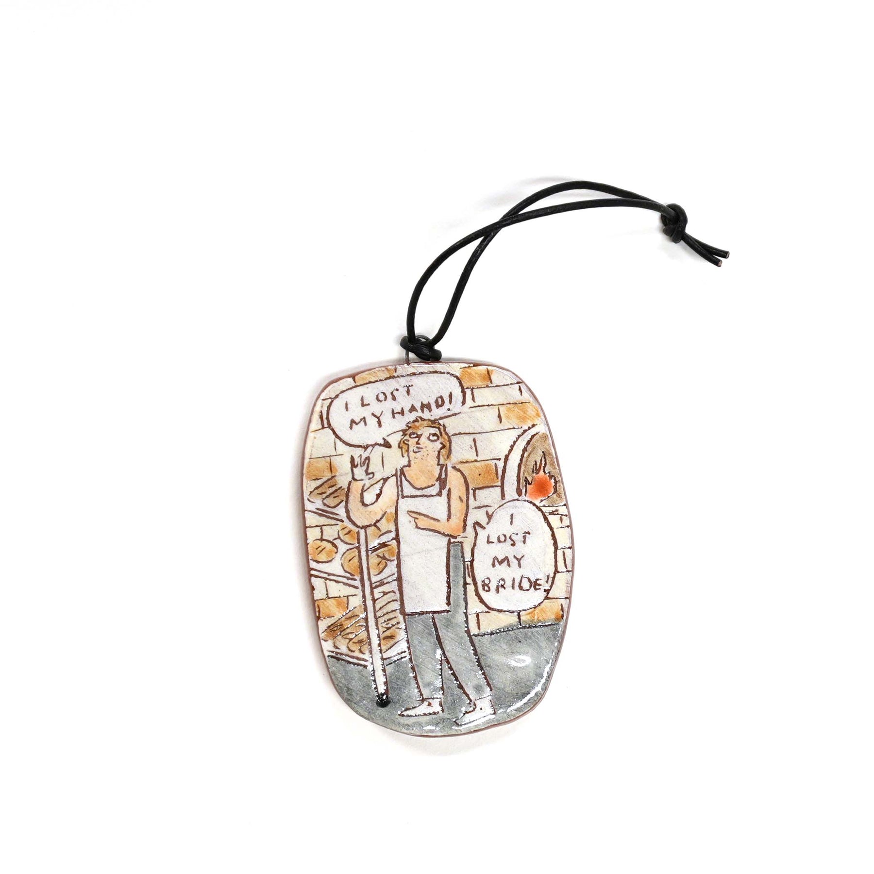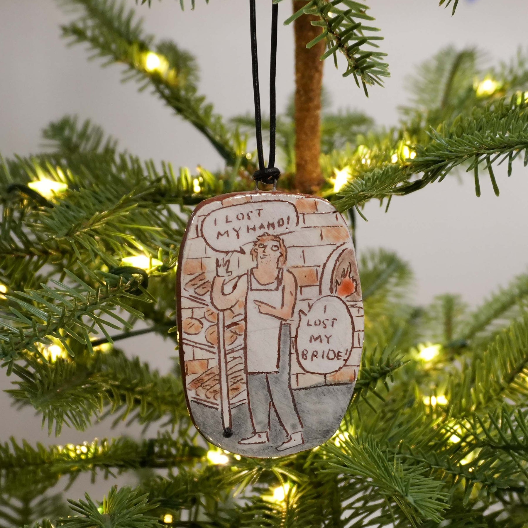 Ronny calls out - "I lost my hand! I lost my bride" in the basement bakery.