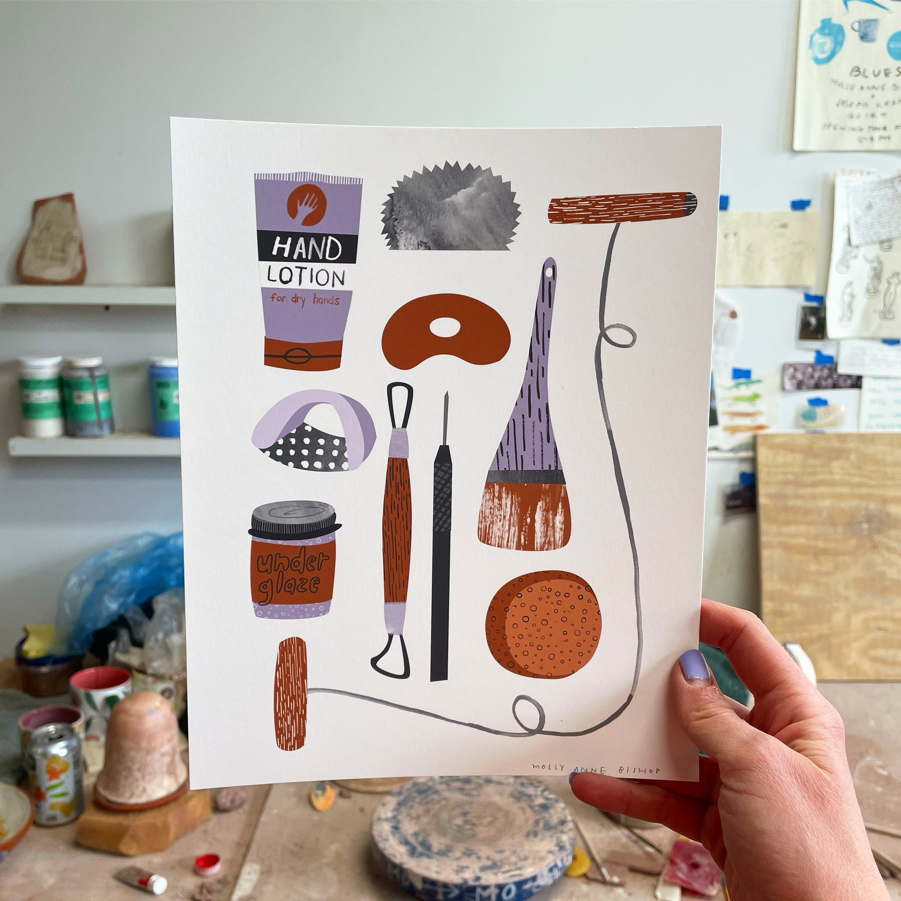 An illustration of some of my go-to ceramic tools - serrated rib, needle tool, rasp, soft goat hair brush, and, of course, hand lotion!
